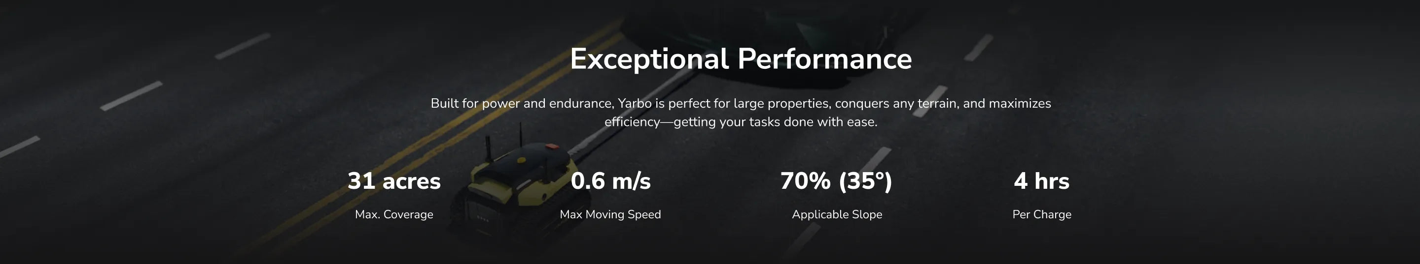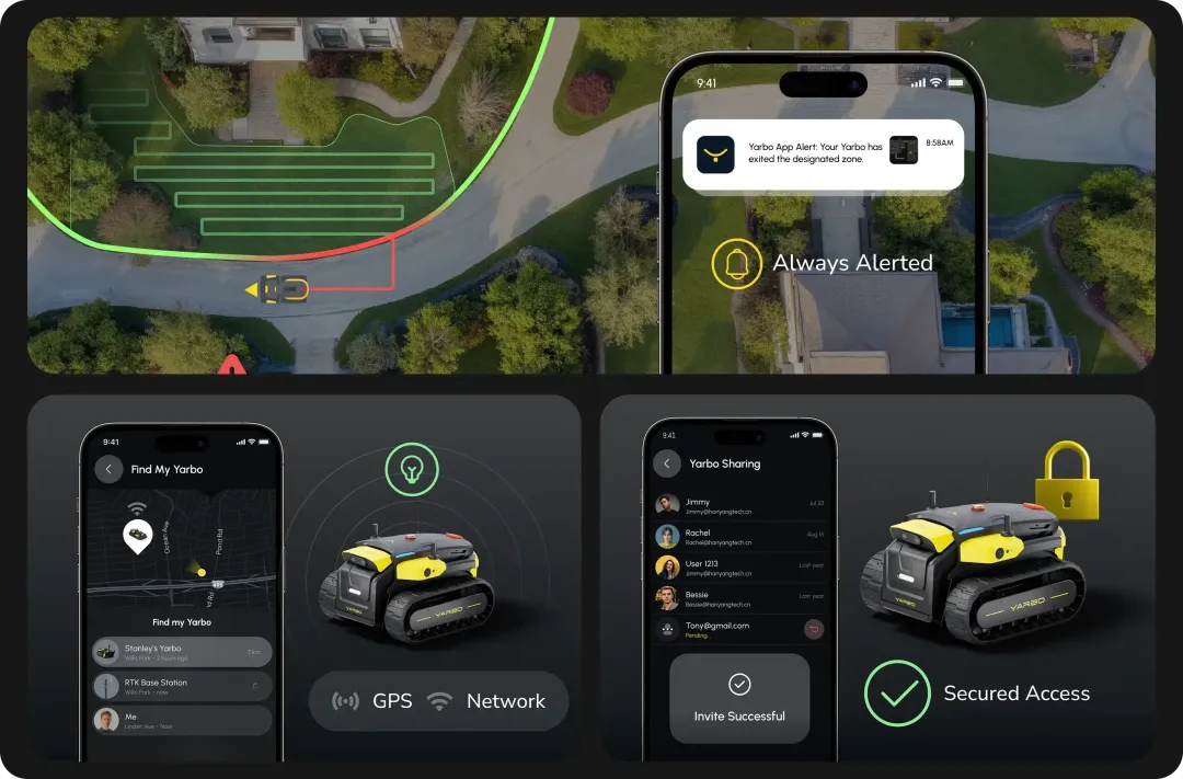 • Mobile Control: Fully controlled via app (iOS/Android) — schedule tasks, draw routes, monitor live video, or drive Yarbo remotely.